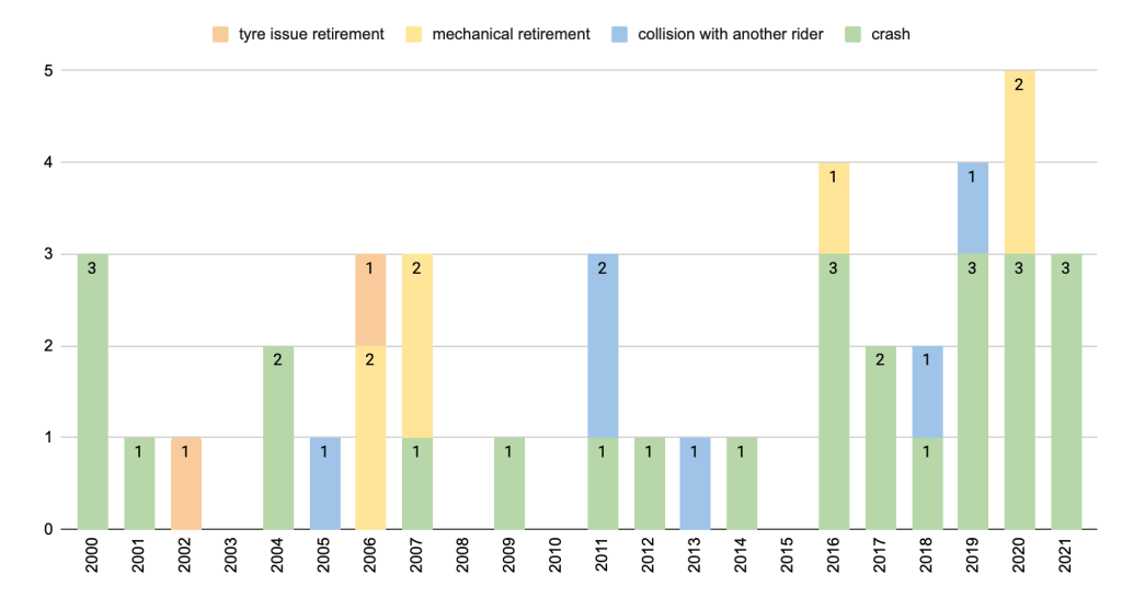 From 2000 to 2021, Valentino Rossi ran a total of 372 races* in the premier class (32 in 500cc and 340 in MotoGP). He didn’t cross the finish line on 41 occasions. Let’s study how that happened.
