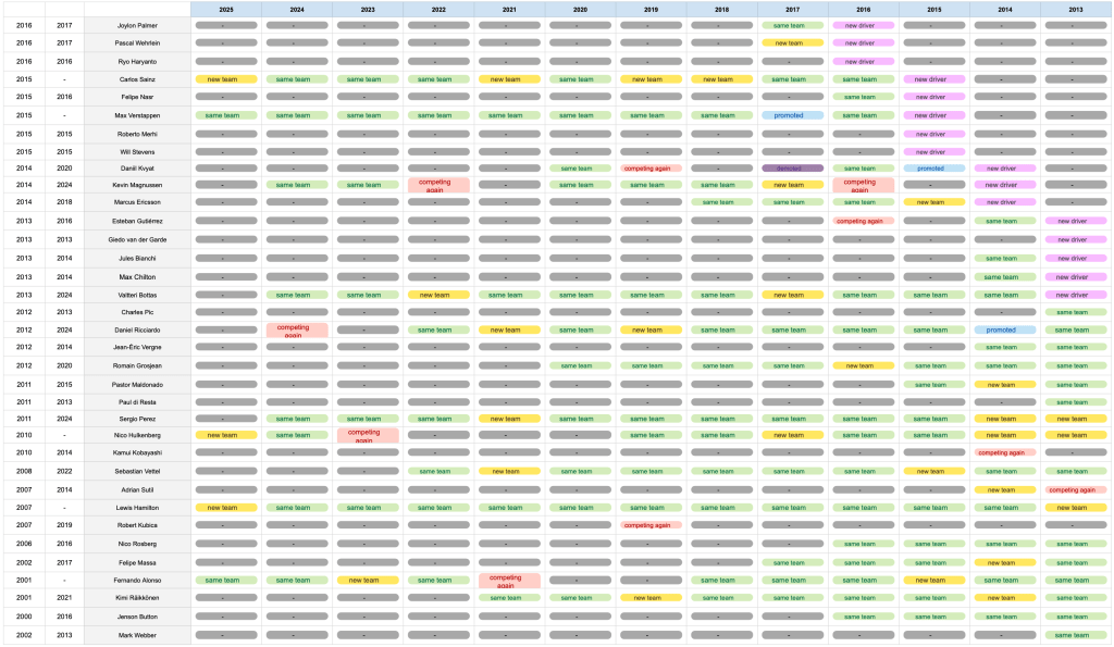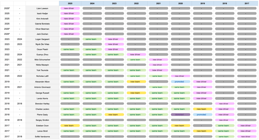 - The comparison is made between the beginning of a season and the beginning of the previous season. This means that the changes from mid-season decisions only show up in the following season (example: Liam Lawson is considered a new driver in 2025 even though he competed several races in 2023 and 2024 ; likewise, Daniel Ricciardo has been considered as « competing again » in 2024 because he didn’t start the 2023 season with a seat).