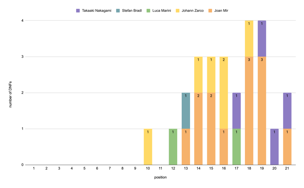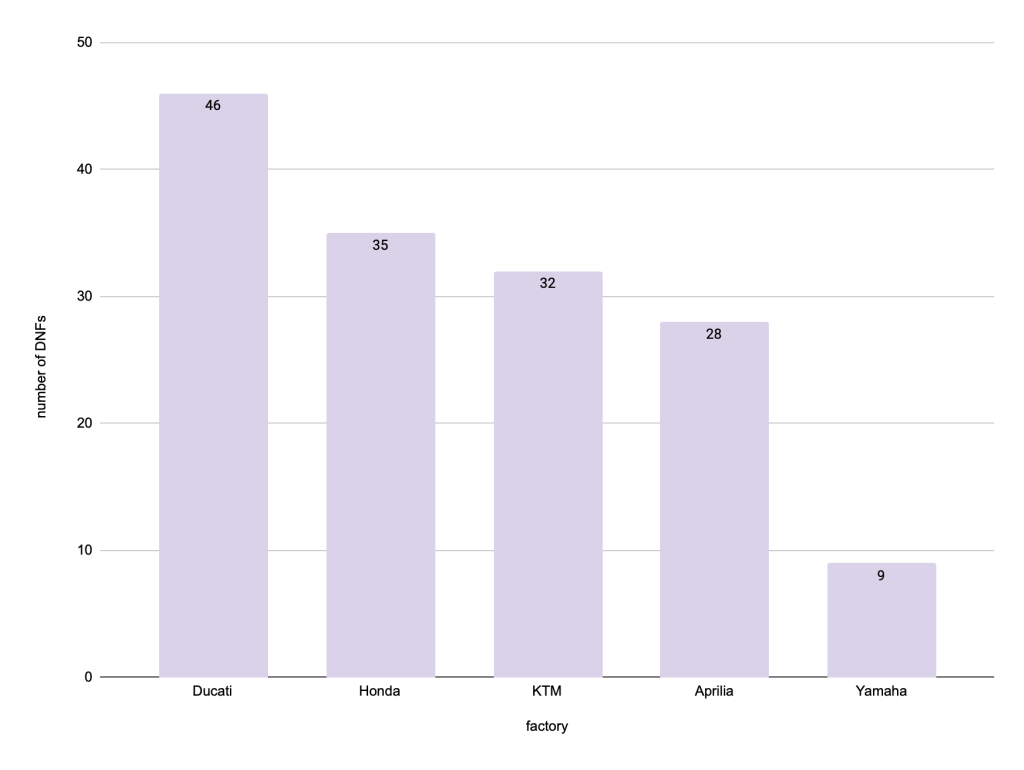 Now we can actually see a difference. Both the Hondas and KTMs tended to not finish 1 in 5 races meanwhile Yamaha was more around 1 in 9 races.