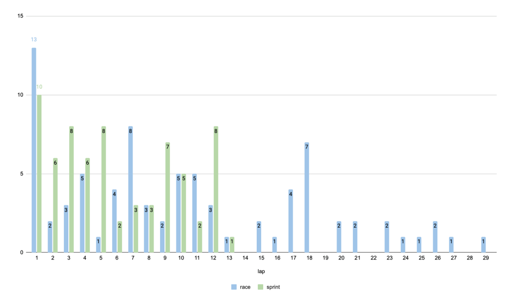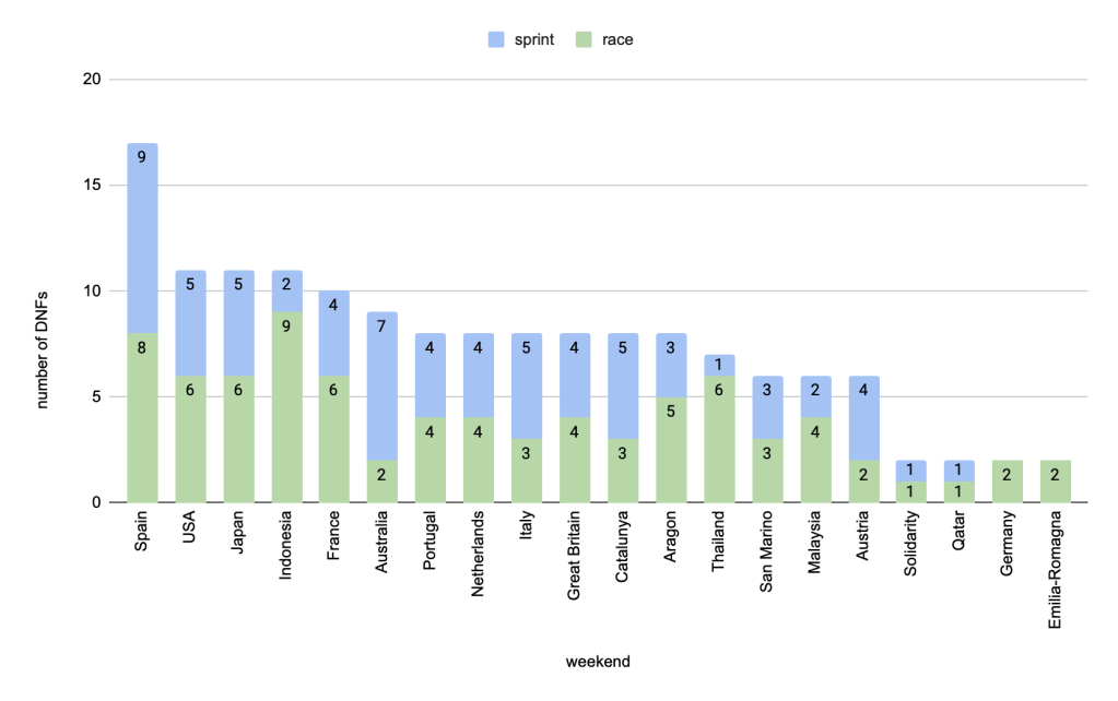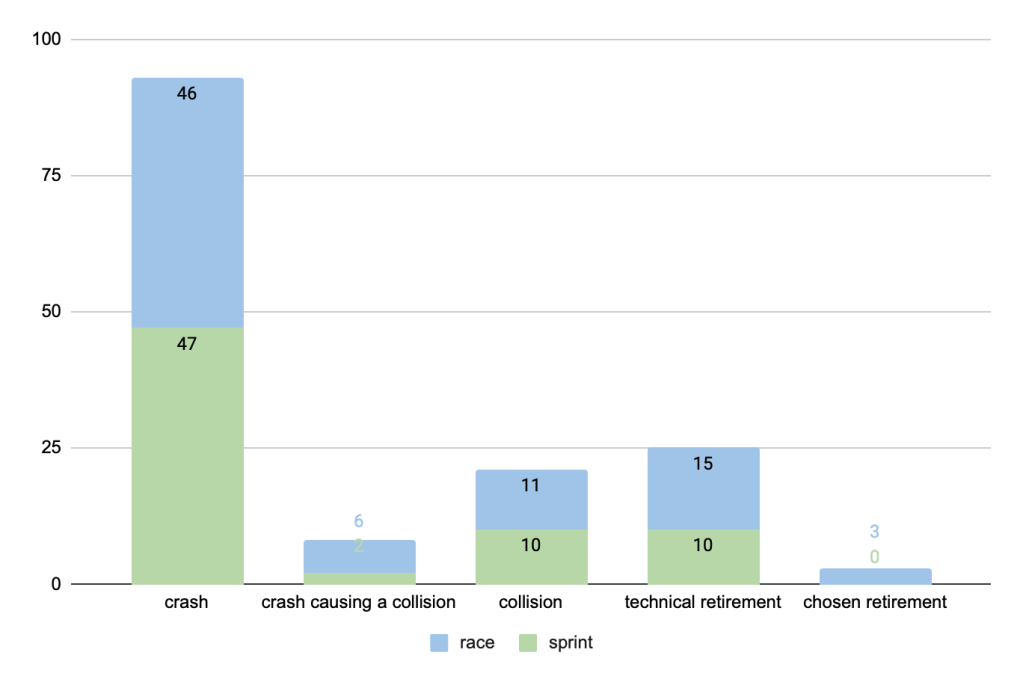 For comparison, in 2023 we had 42 DNFs during sprints (in 19 sprints, so 2.2 per sprint) and 92 DNFs during races (average of 4.6).