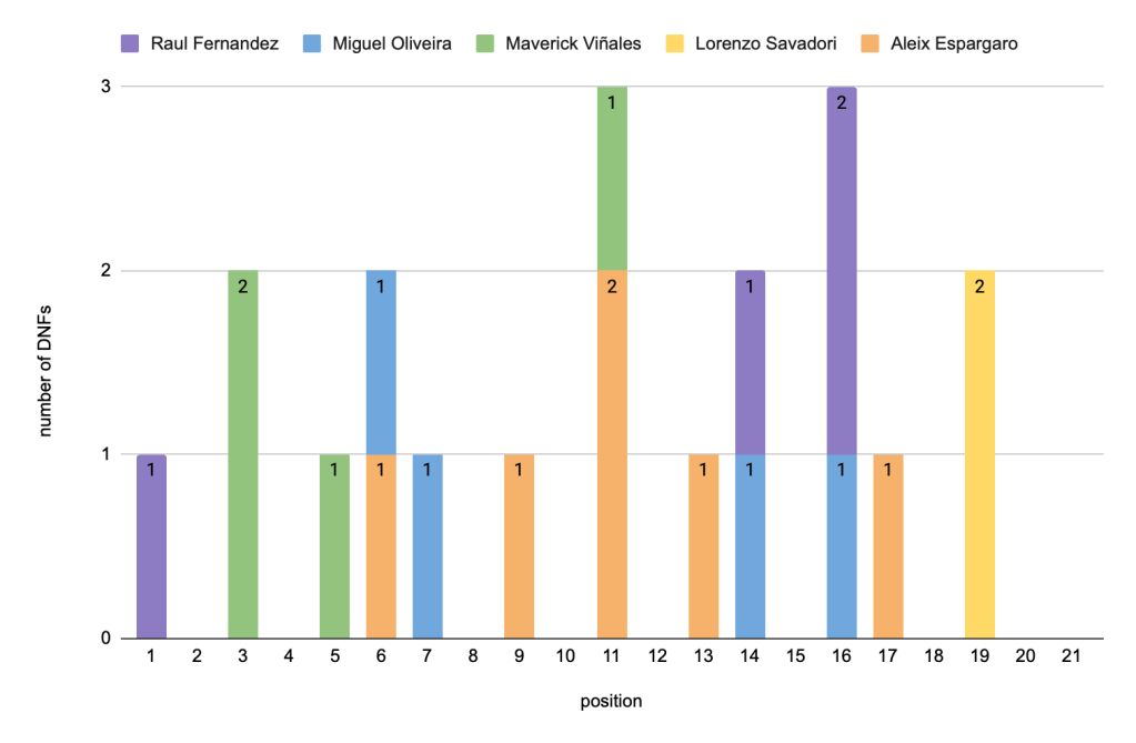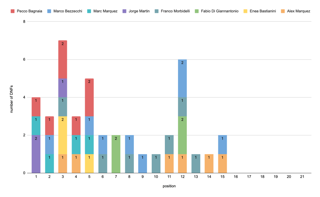Fun fact: we’ve had at least two DNFs from every single position from P1 to P21. And it’s actually quite interesting to not have any DNF from P22 considering the fact that 85% of the 2024 races had at least 22 riders starting and we’ve observed DNFs from the very back of the grid in 2024 (not from P22 or more, though).