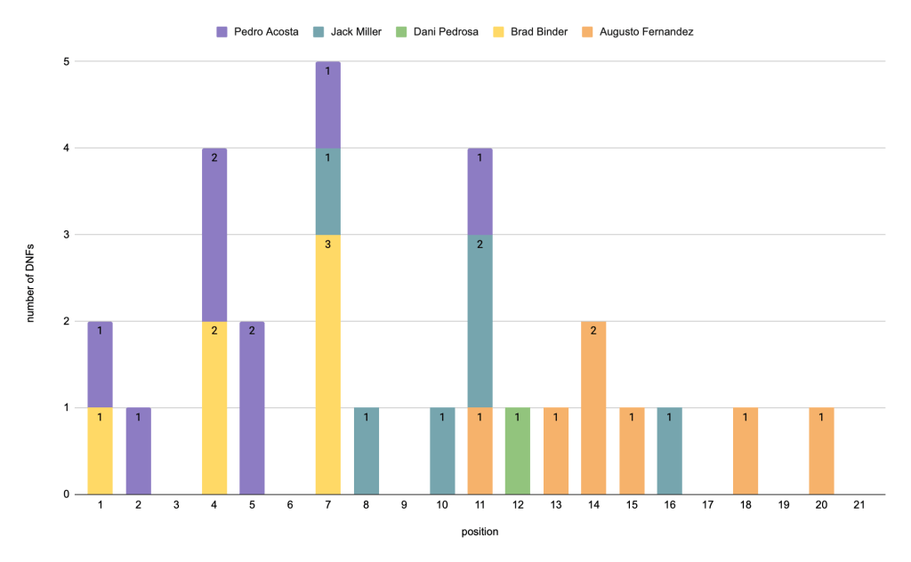 Except for the one Pedro Acosta P11 crash (sprint in Australia), he and Brad Binder never crashed from lower than P7. Jack Miller had crashes from middle of the pack positions (P7 to P16) meanwhile Augusto Fernandez mostly fell from the back of the grid (from P11 to P20).