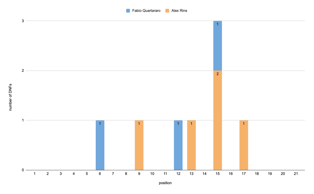 Truthfully not much to say here with how limited the data is, all of these were crashes except for Fabio Quartararo being taken out of the Mugello sprint (in P15) by Miguel Oliveira. Crashes matching with the average results from both Yamaha riders.