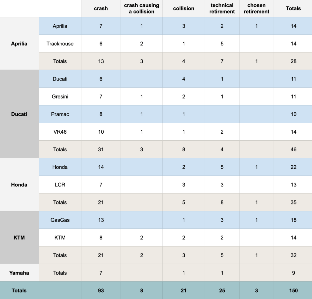A Ducati and a Yamaha had bike issues once every 80 starts meanwhile an Aprilia or an Honda had an issue once every 21 (Honda) to 23 starts (Aprilia). KTM were doing a little better with an issue once every 33 starts an average (still far from the Ducati & Yamaha numbers).