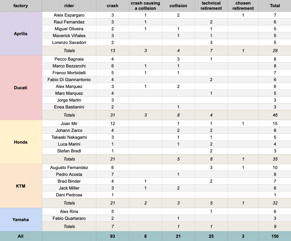 Is Ducati having the most amount of DNFs a surprise? Obviously not, they have the most amount of riders on the grid. Same thing with Yamaha being last, the other way around. To be critical of these numbers, we need to take into account the amount of races started for each factory.