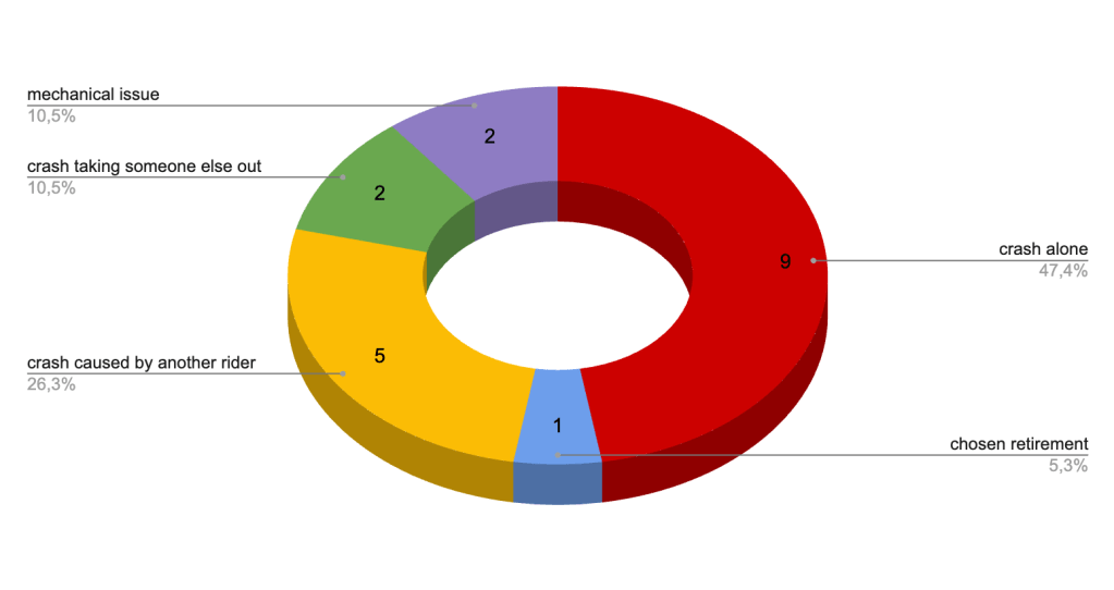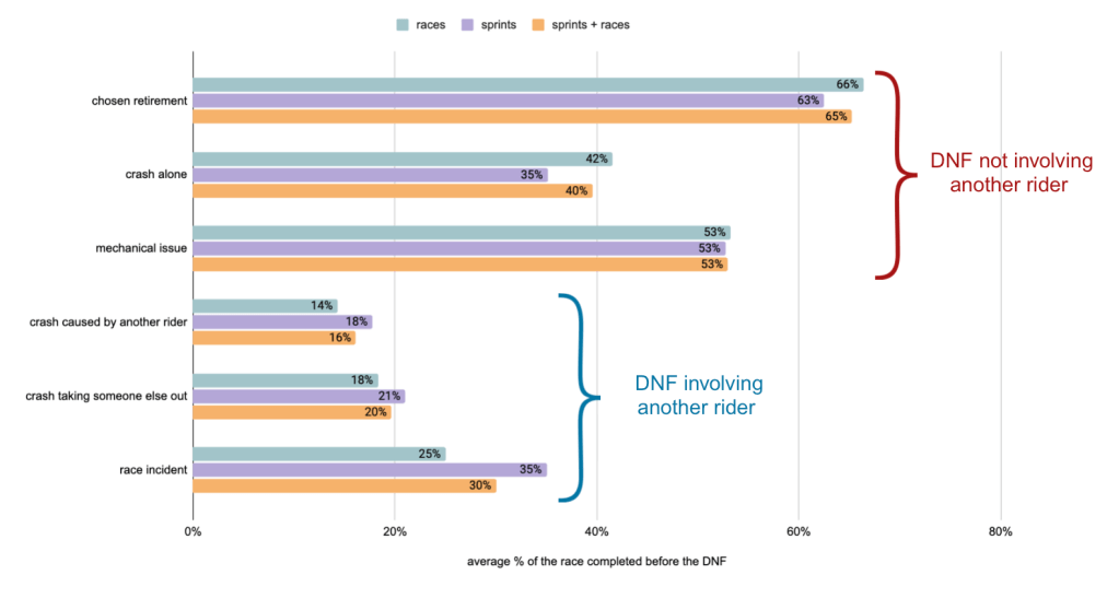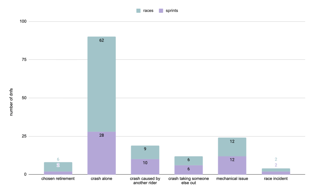 This study is only about the DNFs of the 2025 season, which means I’ve only considered the incidents that lead to a rider not crossing the finish line of a sprint / race, not the crashes and collisions where riders rejoined the race afterward.