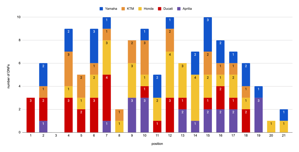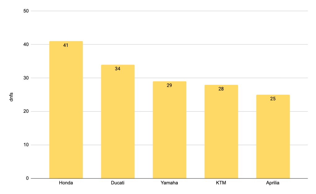 Honda easily, as expected, stays in the lead, having a DNF almost once every 4 starts (23.6% of the time). Behind them, KTM, Yamaha and Aprilia are quite close together with a DNF once every 6 starts (15.2% to 16.7% of the time). Ducati closes the list with a DNF roughly every 8 starts (13% of the time).