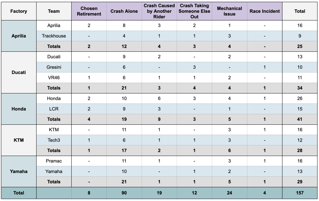 | Factory | Chosen Retirement | Crash Alone | Crash Caused by Another Rider | Crash Taking Someone Else Out | Mechanical Issue | Race Incident |