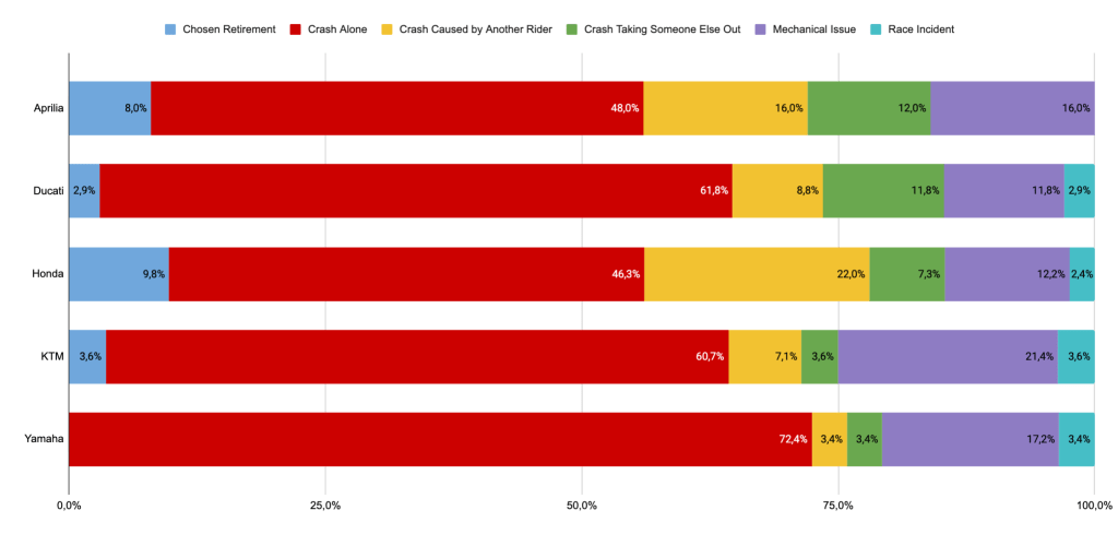 - Yamahas’ DNFs were either caused by riders crashing on their own (72.4%) or by a mechanical issue (17.2%), rarely having interactions with other riders of the grid,
