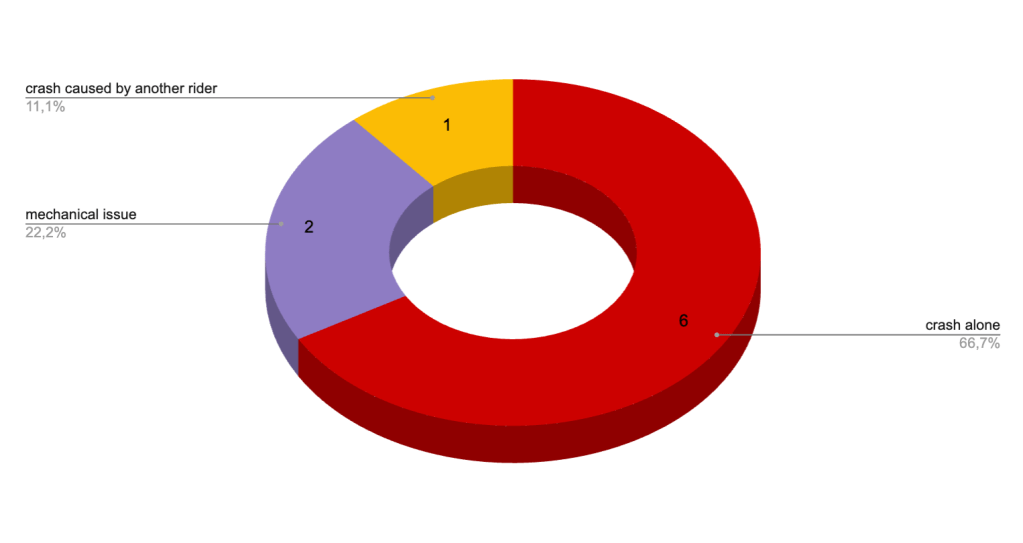 In 2024, 4 out of 9 wildcard/replacement riders DNFs were caused by a technical issue and the other half by a crash. It’s not a repartition that we can find again in 2025.