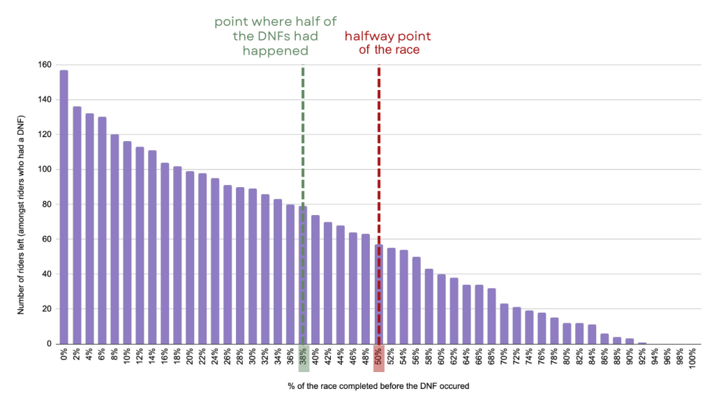 In most cases, a rider is responsible for his own DNF. Crashes caused by another rider + mechanical issues / race incidents only make up for 30% of DNFs.