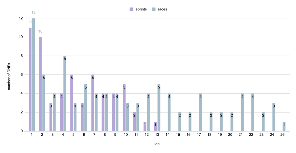 Now, we can observe two categories with a pretty noticeable difference between sprints and races while the other 4 have similar / identical numbers in both cases. Is that normal despite the fact that races are twice the length of sprints with twice the amount of time to DNF? Let’s look at another chart to have some considerations.