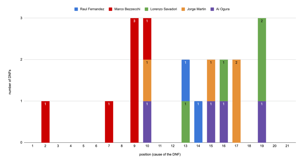 - on the left : the DNFs of Marco Bezzecchi, which happened when he was running between P7 and P10 (except that one time in P2, during the Sachsenring race),