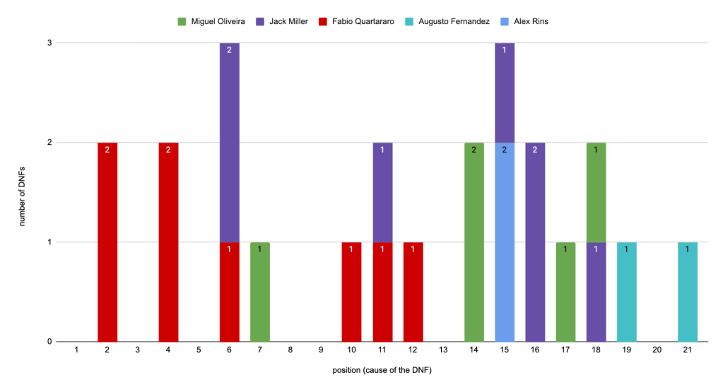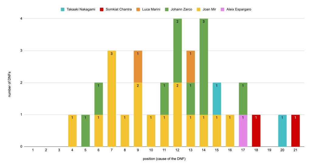 Since we didn’t have any P3 DNF, this section will only focus on the DNFs from P2 that made 6 riders lose a chance at a podium. Just like the previous DNFs (from the lead), all DNFs from P2 were caused by a rider crashing on his own.