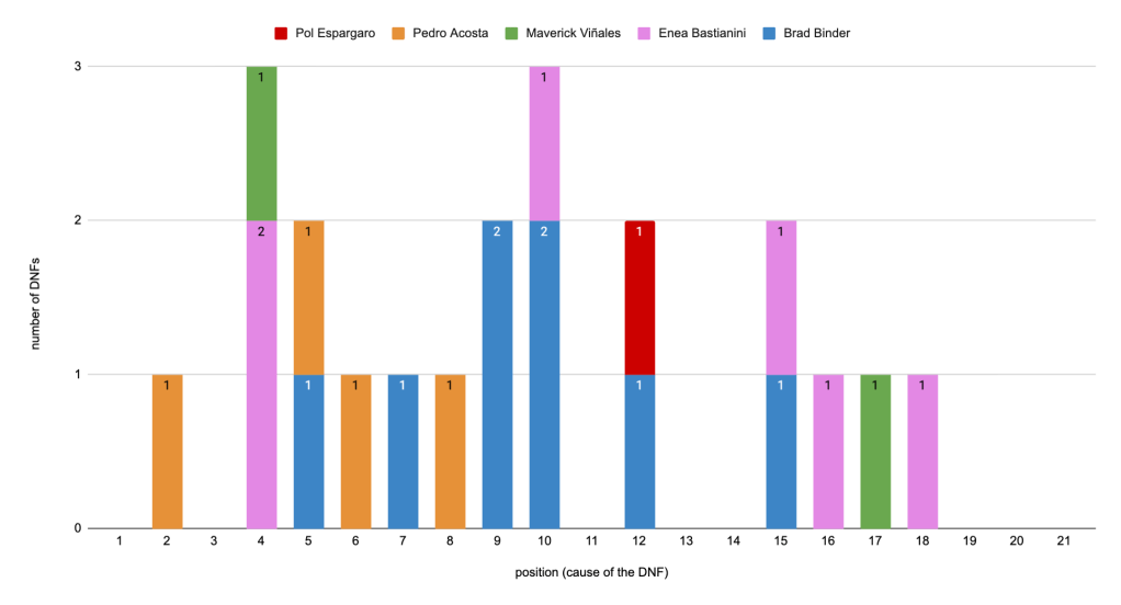 The most murderous sprint was the one in Barcelona (6) followed by the ones in Mandalika and Motegi (5 each). Races wise, the most damage happened in Sachsenring (8 DNFs for that 10-bikes finish) but Barcelona, Misano and Valencia are close behind (7 each).